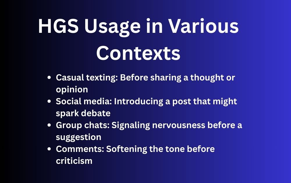Other casual expressions like “Well…” or “Let me try…” also function like HGS slang. They prepare the reader for an opinion, joke, or personal confession. Using these phrases in chats or social media posts softens statements and reduces potential awkwardness.